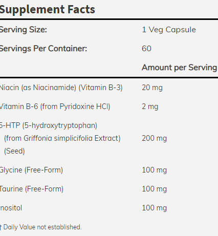 Съставки: 5-Хидрокситриптофан (5-HTP), таурин, глицин, ниацин, витамин В6, инозитол