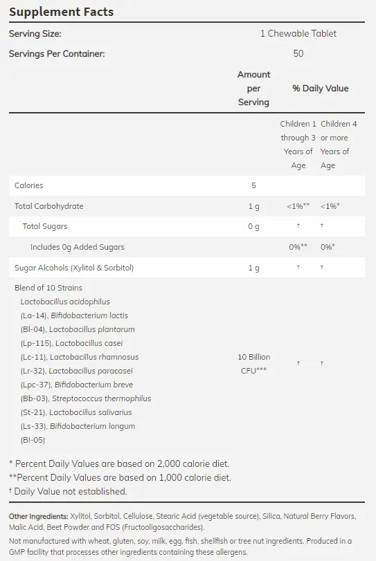 В допълнение, здравословната чревна флора подпомога създаването на подходящи условия за усвояване на необходимите за тялото хранителни вещества. Формулата дъвчащи пробиотици (BerryDophilus) включва в състава си и така наречените фруктоолигозахариди, за да се подпомогне здравословното развитие на пробиотиците ацидофилус и бифидус.
