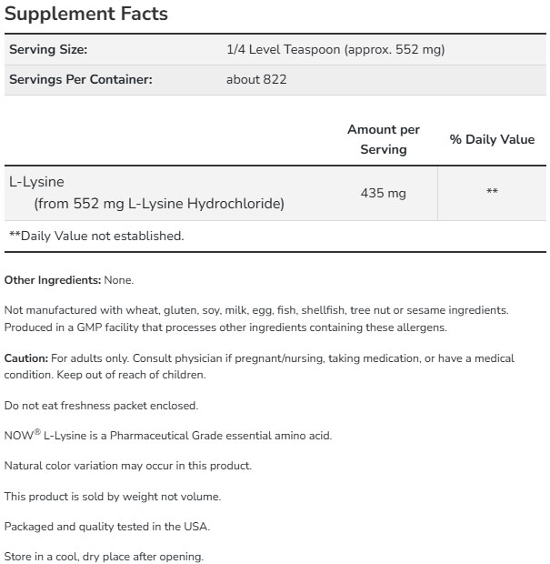 Лизин (Lysine) е есенциална аминокиселина. Стимулира развитието на костната тъкан и растежа. Поддържа нивата на азотния баланс и подпомага усвояването на калция в тялото. Лизин (Lysine) помага при образуването на колаген, при образуването на хормони, ензими и антитела. Той регулира триглициридите в кръвния серум. Лизин (Lysine) се бори с вирусите, които причиняват херпеси и възпалено гърло.