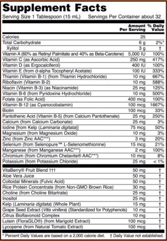 Съставки: витамин А, витамин Е, витамин С, витамин D, витамин В12, витамин В6, ниацин, биотин, тиамин, магнезий, алое вера - сок, селен, хром, калций, манган, инозитол, екстракт от гроздово семе, лутеин, ликопен, оризов протеин - концентрат