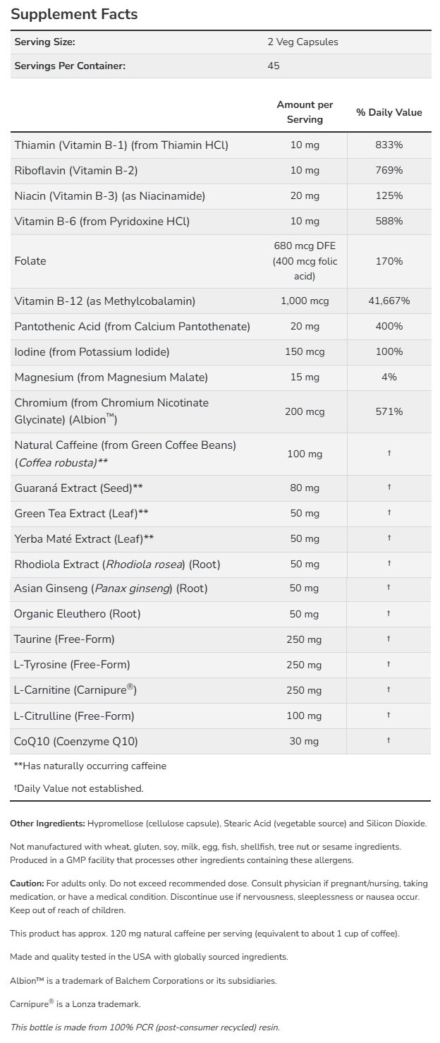 Съставки: л-тирозин, л-карнитин, таурин, екстракт от зелен чай, екстракт от йерба мате, тиамин, кофеин, рибофлавин, ниацин, сибирски женшен, корейски женшен, витамин В12, витамин В6, магнезий, хром, екстракт от гуарана, фолат