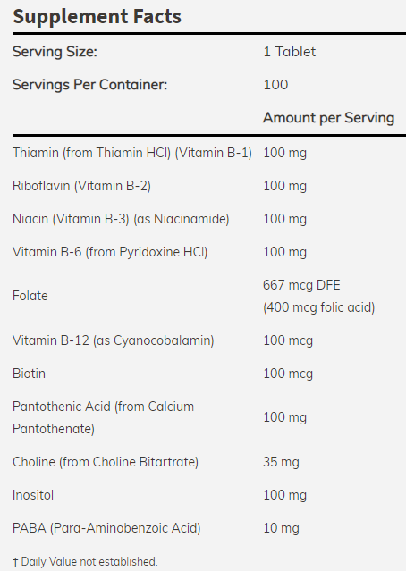B-Complex Vitamin B-100 е пълен комплекс от В-витамини. Има силни синергистични свойства. Повечето от витамините от B-Complex Vitamin B-100 имат индивидуални свойства: