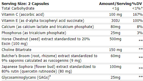 Съставки: витамин С, рутин, гликозаминогликани, витамин Е, калций, фосфор, кестен див - семена