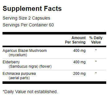 Съставки: Екстракт от тъба Агарикус Блазей (Agaricus Blaze), Екстракт от бъз (Sambucus Canadensis), Пурпурна ехинацея (Echinacea purpurea)