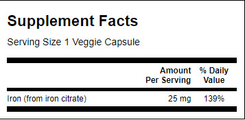 SWANSON Iron Citrate 25mg. / 60 Vcaps е хранителна добавка, под формата на капсули, която съдържа висококачествено желязо.