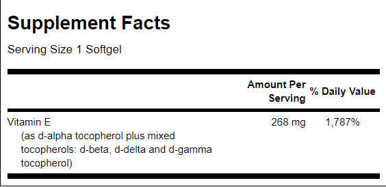 Съставки: Витамин Е (като d-алфа токоферол плюс смесени токофероли: d-бета, d-делта и d-гама токофероли)
