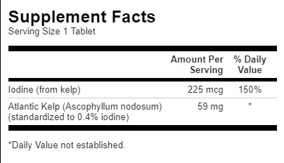 Съставки: Йод (от водорасли), Атлантически келп (Ascophyllum nodosum) (стандартизиран до 0.4% йод)
