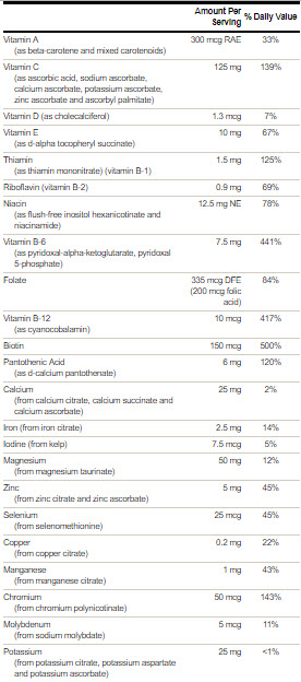 Съставки: DMAE (диметилетиламин), L-глутамин, Бакопа мониери (Bacopa monnieri), L-пироглутаминова киселина, Фосфатидилсерин (соев фосфолипид), DHA концентрат (от рибено масло), холин (от холин битартрат), инозитол, пиридоксал-алфа-кетоглутарат, N-Ацетилтирозин, плод от боровинка (Vaccinium vitis-idaea L), GABA (гама-аминобутирова киселина), екстракт от гроздови семена и екстракт от грозде (Vitis vinifera), електролити концентрат, Хуперизин А (екстракт от Huperzia Serrata), бор (от борен цитрат, бор аспартат, бор глицинат), ванадий (от ванадил сулфат), фолиева киселина, рибофлавин, ниацн, тиамин, йод, манган, цинк, биотин, калий, калций, хром, витамин А, витамин С, витамин В6, витамин В12