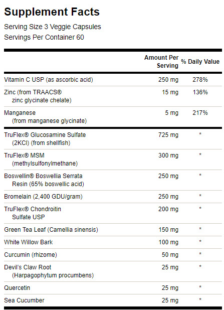 Съставки: витамин С, цинк, TruFlex® глюкозамин сулфат, бромелаин, TruFlex® MSM (метилсулфонилметан), Boswellin® от Босвелия серата (Boswellia Serrata), кверцетин,Листа зелен чай (Camellia Sinensis), Кора от бяла върба (Salix alba), куркумин, Дяволският нокът корен (Harpagophytum procumbens)