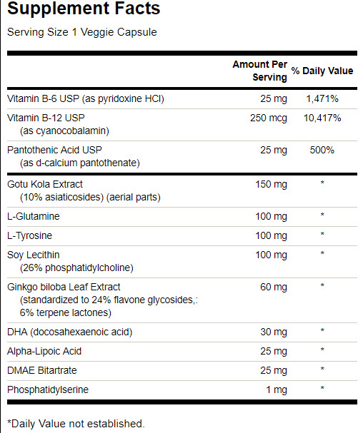 Съставки: витамин В6, витамин В12, пантотенова киселина, л-тирозин, л-глутамин, DHA, екстракт от гинко билоба, соев лецитин, алфа-липоева киселина, DMAE битартрат