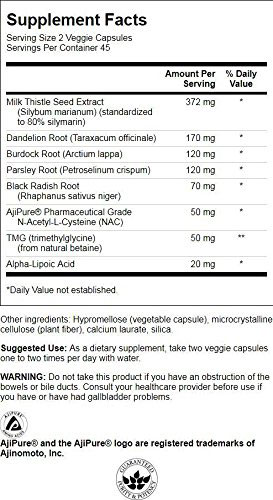 Съставки: AjiPure® фармацевтичен клас N-ацетил-L-цистеин (NAC), екстракт от семена на бял трън, корен от глухарче, корен от репей, корен от магданоз, корен от черна ряпа, триметилглицин - от естествен бетаин, алфа-липоева киселина