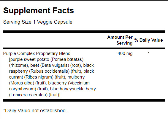 Съставки: Антиоксидантен комплекс от пурпурни плодове и зеленчуци [Лилав сладък картоф (Dioscorea alata), черна малина (Rubus occidentаlis L.), касис (Ribes nigrum), черница (Morus), боровинки (Vaccinium), плодове от орлови нокти (Lonicera)