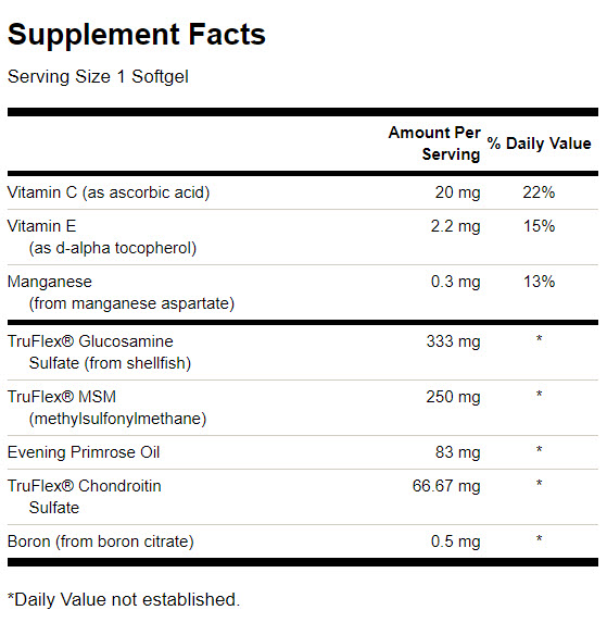 Съставки: TruFleх комплекс с МСМ, TruFleх комплекс с глюкозамин сулфат, TruFleх с хондроитин сулфат, масло от вечерна иглика