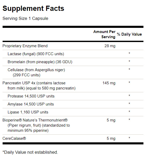 Съставки: Патентована ензимна смес – съдържа Лактаза, Бромелаин (от ананас), Келлулаза (от Aspergillus niger), Панкреатин (съдържа лактоза от мляко) – съдържа естествените храносмилателни ензими липаза, протеаза, амилаза, Bioperine® Nature's Thermonutrient® (от плодове на Piper nigrum), CereCalase® - съдържа ензимите хемицелулаза, бета-глюканаза и фитаза