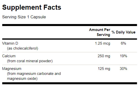 Съставки: витамин D, Магнезий (От магнезиев карбонат, магнезиев оксид и коралов минерален прах), Калций (от коралов минерален прах)