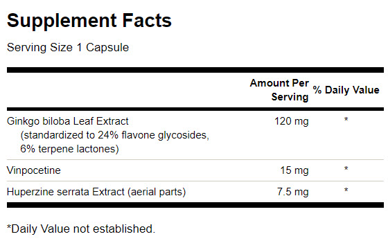 Съставки: Гинко билоба екстракт от листа(Ginkgo biloba), Хуперзия серата екстракт (Huperzia Serrata), Винпоцетин