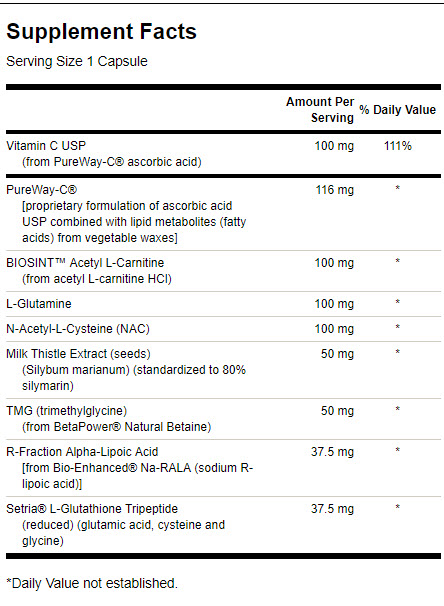 Съставки: Витамин С (от PureWay-C® аскорбинова киселина), PureWay-C® [патентована формулировка на аскорбинова киселина USP в комбинация с липидни метаболити (мастни киселини) от растителни восъци], BIOSINT ™ ацетил L-карнитин (от ацетил L-карнитин HCl) , L-глутамин, N-ацетил-L-цистеин (NAC), екстракт от бял трън (семена) (Silybum marianum) (стандартизиран до 80% силимарин чрез UV), TMG (триметилглицин) (от BetaPower® Natural Betaine), R- Фракция алфа-липоева киселина [от Bio-Enhanced® Na-RALA (натриева R-липоева киселина)], Setria® L-глутатион трипептид (редуциран) (глутаминова киселина, цистеин и глицин)