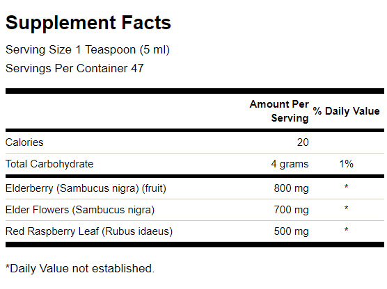 Съставки: Екстракт от плод на Бъз ( Sambucus nigra), Екстракт от цвят на Бъз ( Sambucus nigra), Листа от червена малина ( Rubus idaeus)