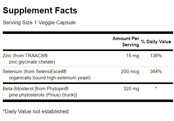Съставки: Цинк (от TRAACS® цинков глицинат хелат), селен (от селенови дрожди), бета-ситостерол (от фитостероли Phytopin® бор) (бор / кора)