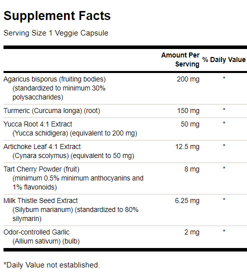 Съставки: Двуспорова печурка (Agaricus bisporus ) , Куркума (Curcuma Longa) , Юка корен 4: 1 екстракт (Yucca schidigera) , Артишок екстракт 4: 1 (Cynara scolymus), Вишна на прах (Prunus cerasus), Екстракт от семена от бял трън (Silybum marianum), Чесън (Allium sativum)