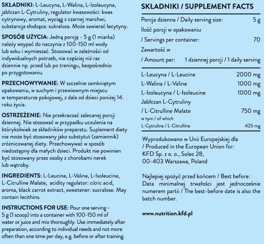 Съставки: L-левцин, L-валин, L-изолевцин, L-цитрулин малат, регулатор на киселинността: лимонена киселина, аромат, екстракт от черен морков, подсладител: сукралоза. Може да съдържа лецитин.