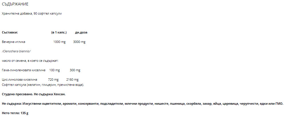 Продукта е източник на ненаситени мастни киселини, особено линолова и гама-линоленова киселина.