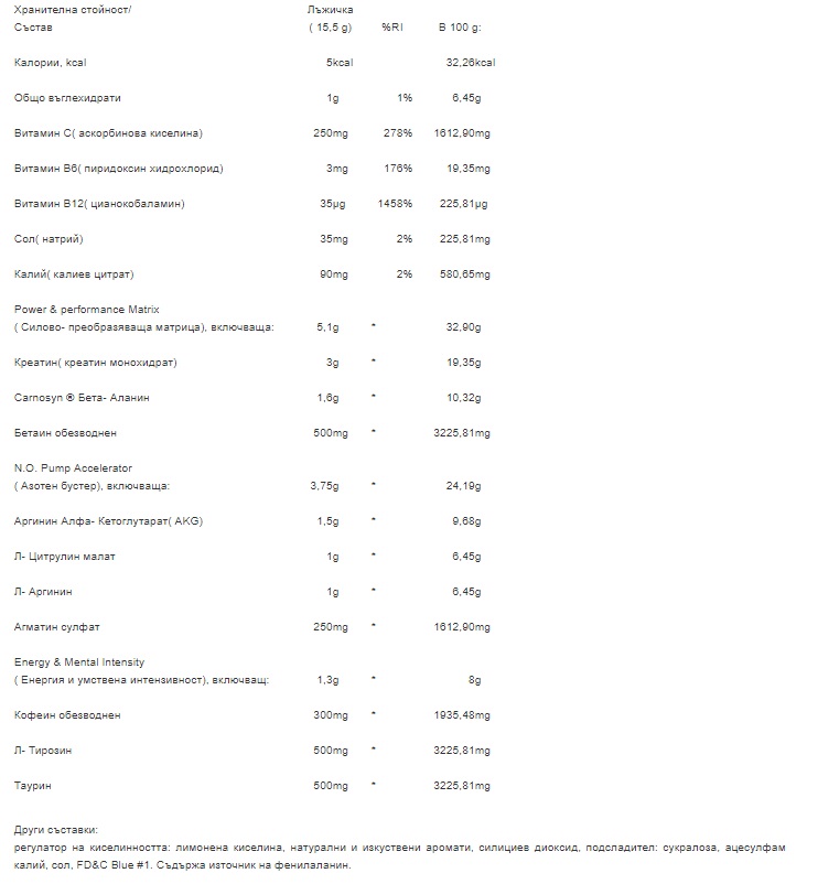 Съставки: таурин, кофеин, л-тирозин, агматин сулфат, витамин С, витамин В6, витамин В12, калий, креатин, бета-аланин, л-аргинин, агматин сулфат, л-цитрулин малат