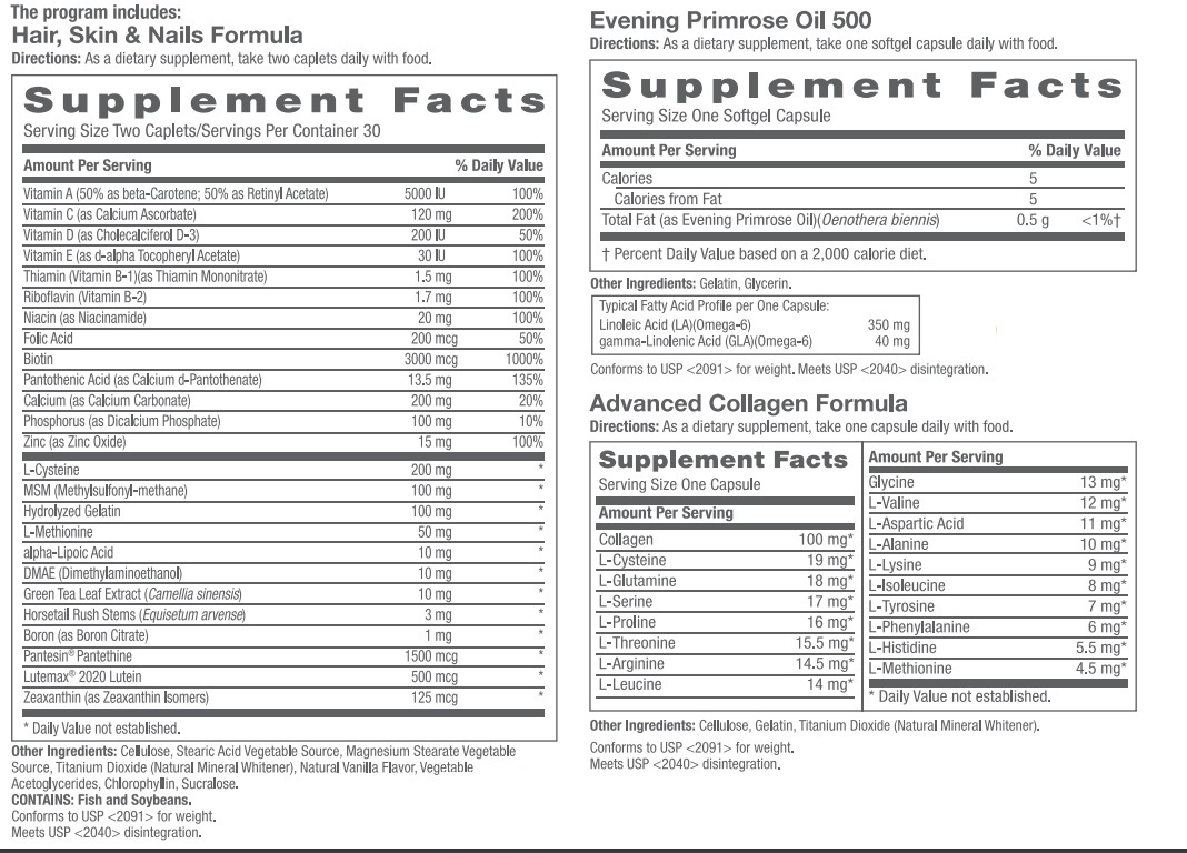 Съставки: витамин А, витамин Е, витамин С, витамин D, цинк, тиамин, рибофлавин, ниацин, биотин, фолиева киселина, калций, фосфор, МСМ комплекс, л-цистеин, алфа-липоева киселина, DMAE, зелен чай - екстракт, биотин