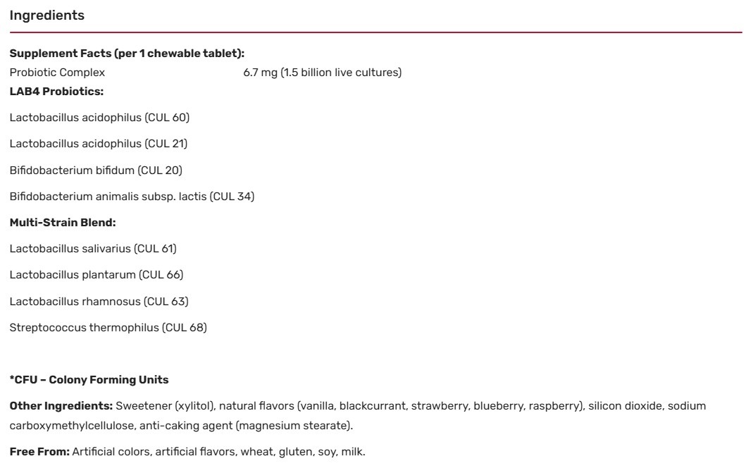 Съставки: lactobacillus acidophilus CUL 60, lactobacillus acidophilus CUL 20, bifidobacterium bifidum CUL 20, bifidobacterium animalis subsp lactis CUL 34, lactobacillus salivarius, lactobacillus pantarum