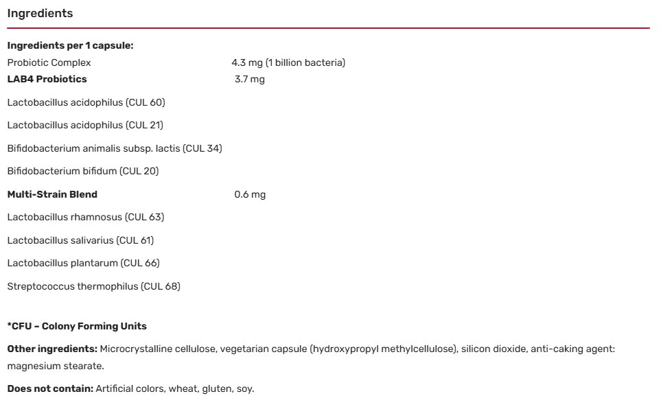 Съставки: lactobacillus acidophilus CUL 60, lactobacillus acidophilus CUL 21, bifidobacterum bifidum CUL 20, bifidobacterium animalis subsp. lactis CUL 34, lactobacillusplantarum CUL 66