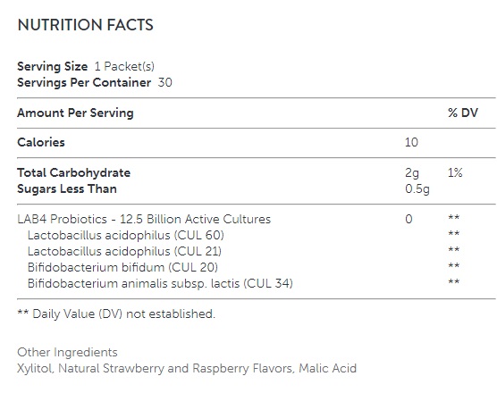 Съставки: Lactobacillus acidophilus (CUL 60), Lactobacillus acidophilus (CUL 21) , Bifodobacterium bifidum (CUL 20) , Bifodobacterium animalis subsp. lactis (CUL 34)