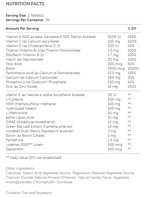 Съставки: витамин А, витамин Е, витамин С, витамин D, тиамин, рибофлавин, ниацин, биотин, фолиева киселина, цинк, калций, фосфор, МСМ комплекс, л-цистеин, алфа-липоева киселина, зелен чай - екстракт от листа, биотин, заексантин, DMAE