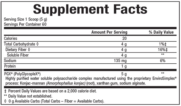 PGX е уникална смес от избрани силно вискозни разтворими фибри, които действат синергично, за да развият по-високо ниво на вискозитет и разширяване във вода, отколкото при същото количество поотделно. PGX се свързва с водата в стомаха и тънките черва, за да образува желатинова, вискозна маса, която забавя абсорбцията на глюкоза (въглехидрати), като в същото време регулира кръвната захар, предизвиква усещане за ситост и намалява усвояването на калории. PGX също спомага за намаляване нивата на холестерол и липиди чрез свързване на мазнините и холестерола в червата, за да се екскретира.