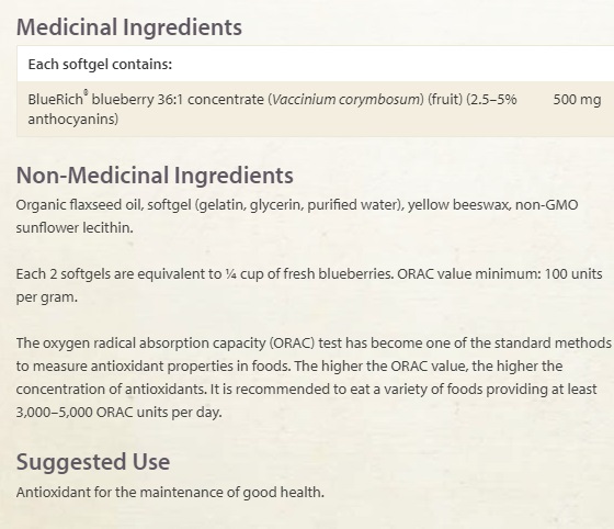 Всяка софтгел капсула осигурява подкрепа за зрението, забавя преждевременното стареене, подпомага тялото срещу инфекции на пикочните пътища. Това се дължи на биоактивните вещества в синята боровинка- антоцианини както и антиоксиданти за сигурна защита от свободните радикали.