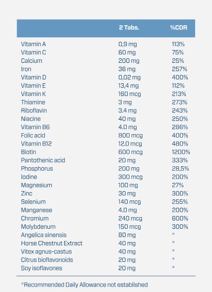 Съставки: Calcium, phosphorus, magnesium, Angelica sinensis, Vitamin C, Niacin, Indian horse chestnut Extract, Vitex agnus-castus, iron, zinc, pantothenic acid, citrus bioflavonoids, Isoflavone Soy, Vitamin E, Vitamin B6, manganese, riboflavin, thiamine, Vitamin A, folic acid, biotin, iodine, chromium, Vitamin K, molybdenum, selenium, vitamin B12, vitamin D, bulking agent: maltodextrin,