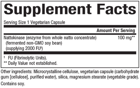 Натокиназа на Natural Factors, Canada представлява ензим, извлечен от концентрат на преминали през ферментационен процес соеви не-ГМО зърна нато.