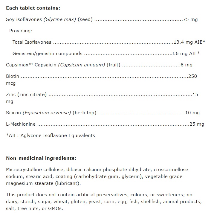 Съставки: Соя изофлавони, Capsimax ™ Капсаицин, биотин, цинк, л-метионин