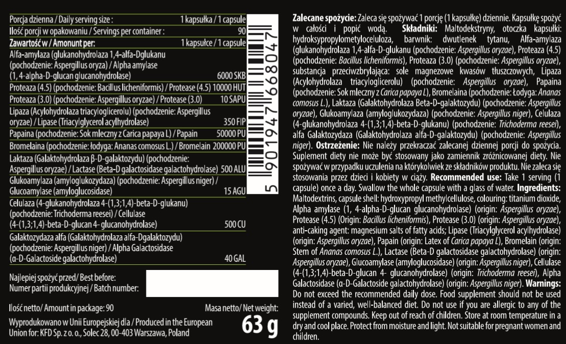 Cъcтaвĸи: Малтодекстрини, обвивка на капсулата: хидроксипропил метилцелулоза, оцветител: титанов диоксид, алфа амилаза (1,4-алфа-D-глюкан глюканохидролаза) (произход: Aspergillus oryzae), протеаза (4.5) (произход: Bacillus licheniformis), протеаза (3.0) (произход: Aspergillus oryzae), анти-слепващ агент: магнезиеви соли на мастни киселини; липаза (триацилглицерол ацилхидролаза) (произход: Aspergillus oryzae), папаин (произход: Carica papaya L), бромелаин (произход: Ananas comosus L), лактаза (бета-D галактозидаза галактохидролаза) (произход: Aspergillus oryzae), глюкоамилаза (амилоглюкозидаза) (произход: Aspergillus niger), целулаза (4- (1,3; 1,4) -бета-D-глюкан 4- глюканохидролаза) (произход: Trichoderma reesei), алфа галактозидаза (aлфа-D-галактозидна галактохидролаза) (произход : Aspergillus niger).