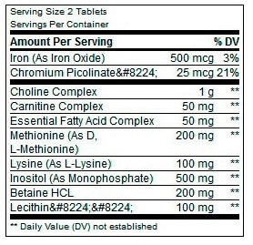 Съставки: холин комплекс, карнитин комплекс, д-метионин, лизин, бетаин HCL, лецитин, инозитол, хром, желязо