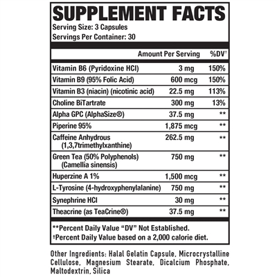 Съставки: витамин В6, витамин В9, витамин В3, холин битартрат, кофеин, пиперин, екстракт от зелен чай, хуперзин, л-тирозин, синефрин