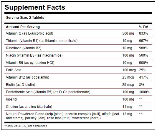 Съставки: витамин С, витамин В12, витамин В6, тиамин, рибофлавин, ниацин, рибофлавин, инозитол, холин, расителна бленда - ацерола, алфа-алфа, магданоз, екстракт от шипка