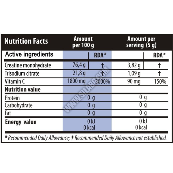 Формулата на Creatine 100% наTREC е обогатена с вит. С и натрий. Витамин С е антиоксидант, който предпазва организма от дейността на свободните радикали при физическо натоварване, докато натрият регулира баланса на течности и електролите в тялото като също така подобрява анаболния ефект. За дълготрайни резултати комбинирайте креатина със суроватъчен протеин, аминокиселини.