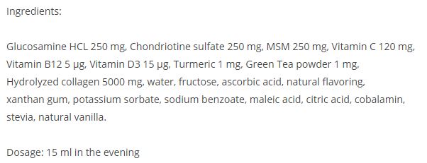 Съставки: глюкозамин сулфат, хондроитин сулфат, МСМ комплекс, хидролизиран колаген, екстракт от зелен чай, куркума, витамин С, витамин В12, витмин D3, л-карнитин