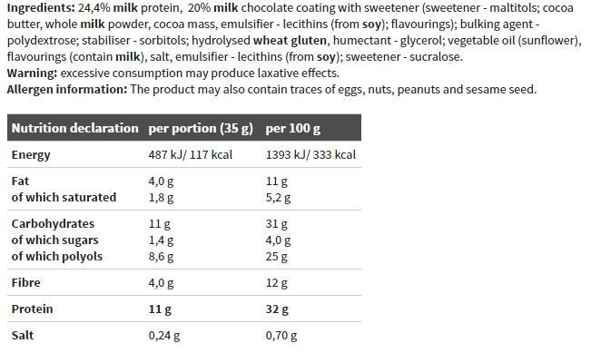 24,4% протеинова смес, черупка от 20% млечен шоколад с подсладител, полидекстрозен подсладител, стабилизатор - сорбитол, хидролизиран пшеничен глутен, водозадържащо вещество - глицерин, слънчогледово масло, аромати, сол, емулгатор соев лецитин, подсладител - сукралоза.