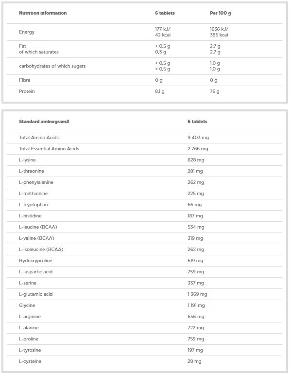 Съставки: 84% пилешки протеинов хидролизат; насипно вещество - калциев карбонат, остъкляващ агент - поливинилов алкохол (PVA), магнезиеви соли на мастни киселини, талк; средства против слепване - силициев диоксид, полиетилен гликол.