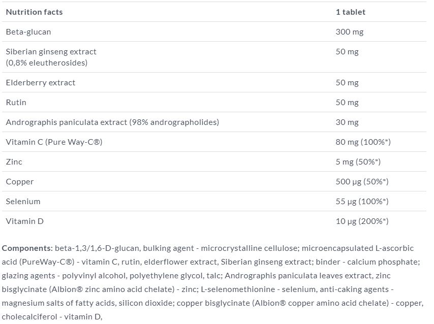 Съставки: бета-глюкан, микрокапсулирана L-аскорбинова киселина (PureWay-C®) - витамин С, рутин, екстракт от бъз, екстракт от сибирски женшен; Екстракт от листа на Andrographis paniculata, цинк; L-селенометионин - селен, мед, витамин D.