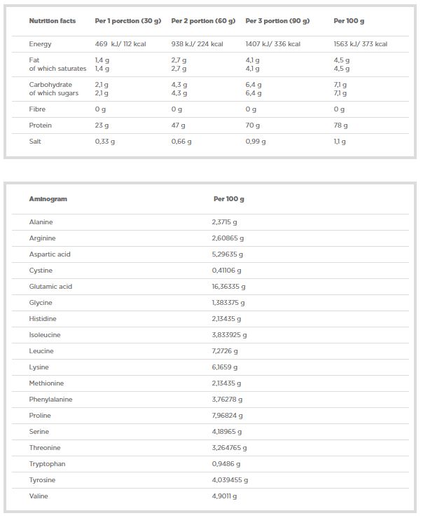Съставки: мицеларен казеин, аминокиселинен профил - аргинин, глутамин, глицин, тирозин, триптофан, метионин