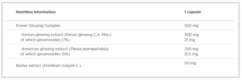 Съставки: корейски женшен, американски женшен, екстракт от ечемик