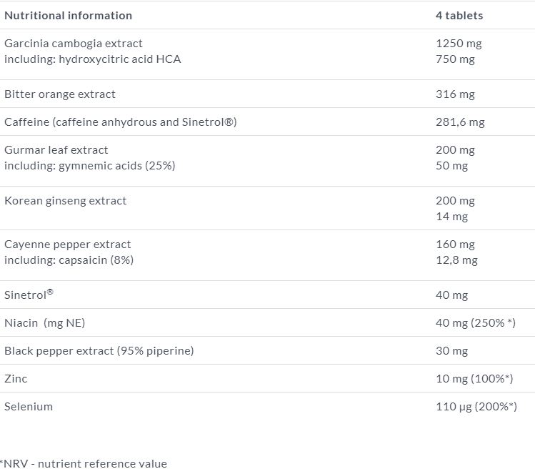 Съставки: горчив портокал, кофеин, гарциния камбоджа, корейски женшен, лют червен пипер, синетрол, ниацин, черен пипер - екстракт - 95% биоперин, цинк, селен