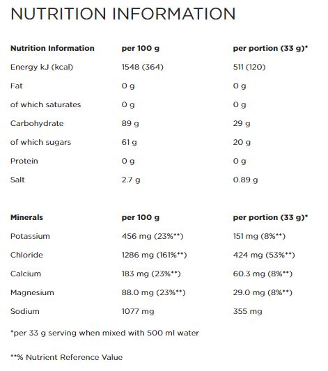 Съставки: декстроза, малтодекстрин, фруктоза, минерали (натриев цитрат, натриев хлорид, калциев лактат, калиев хлорид, магнезиев карбонат), регулатор на киселинността (лимонена киселина), натурален портокалов аромат с други натурални аромати, концентрат (шафран, лимон), сок от цвекло на прах